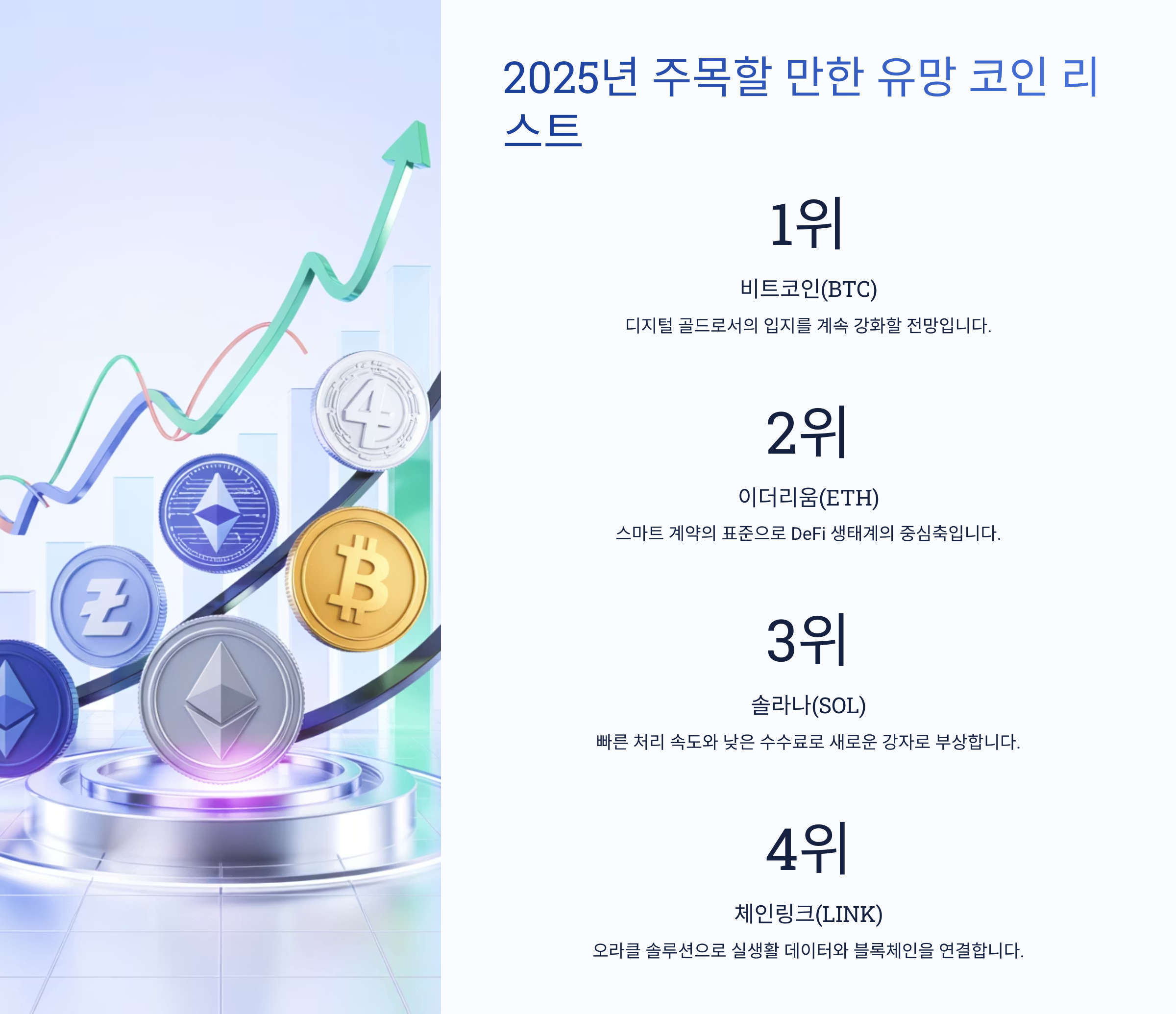 2025년 주목할 코인들은 공통점이 있어요. 실제 사용처(유틸리티)가 명확하고, 기관 투자자들의 관심이 몰리고 있다는 점이죠.