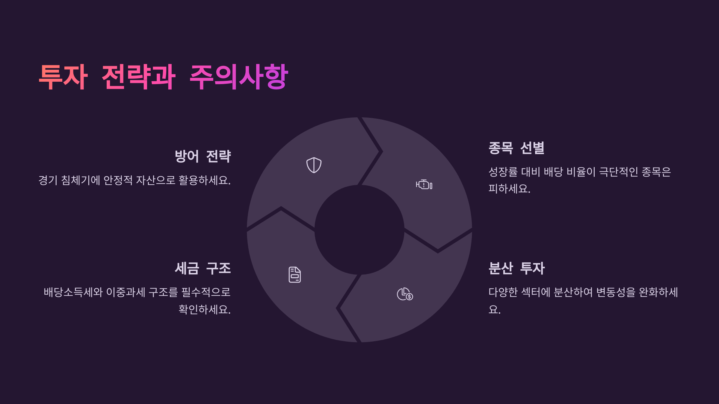 세 번째는 '분산 투자'예요. 개별 고배당 주식에 직접 투자하는 것보다 ETF를 통해 간접 투자하면 리스크를 줄일 수 있어요. 특히 한두 기업의 실적 악화로 인한 타격을 최소화할 수 있답니다.