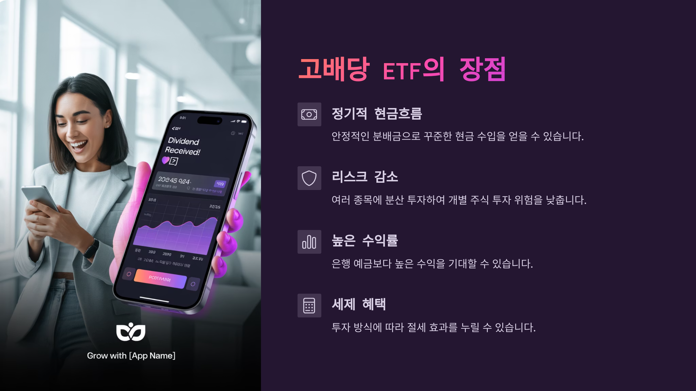무엇보다 초보 투자자에게도 적합하다는 점이 큰 장점이에요. 개별 주식을 직접 고르지 않아도 되고, 배당 수익률이 자동으로 반영된 포트폴리오에 투자하게 되니까요.