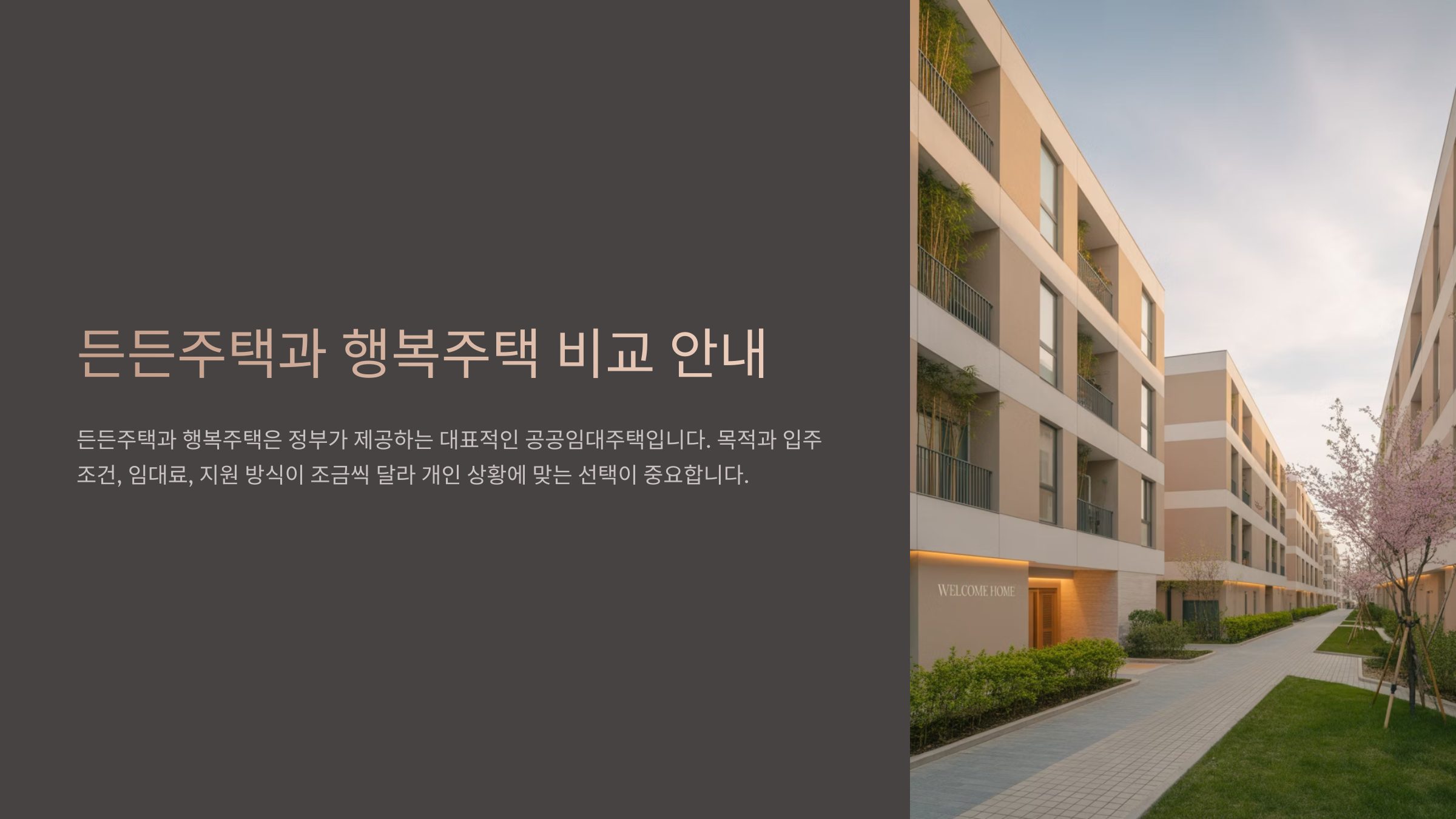 든든주택과 행복주택은 정부가 제공하는 대표적인 공공임대주택이에요. 하지만 그 목적과 입주 조건, 임대료, 지원 방식이 조금씩 다르기 때문에 어떤 것이 더 적합한지는 개인의 상황에 따라 달라질 수 있어요. 지금부터 두 주택의 차이를 하나씩 비교해볼게요! 😊