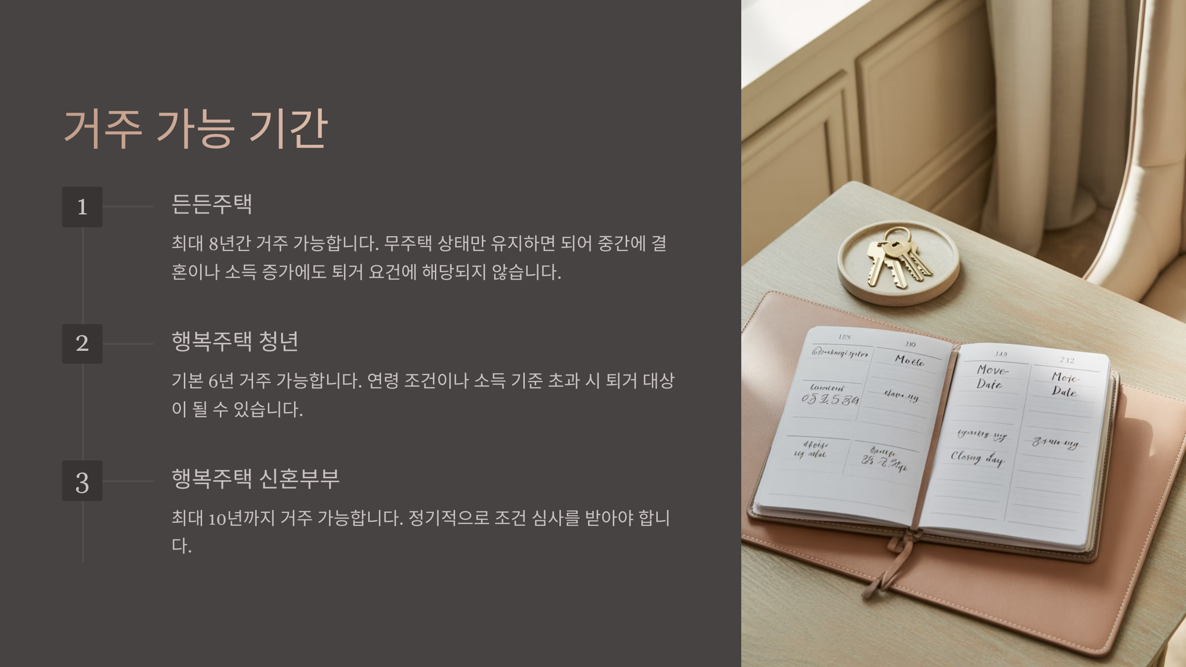 행복주택의 경우 청년은 기본 6년, 신혼부부는 최대 10년까지 거주 가능해요. 단, 연령 조건이나 결혼 유무, 자녀 유무에 따라 중간에 자격이 변경될 수 있어 퇴거 요건도 발생할 수 있어요. 예를 들어 청년 입주자가 40세가 넘거나, 소득이 일정 기준을 초과하면 퇴거 대상이 될 수 있죠.