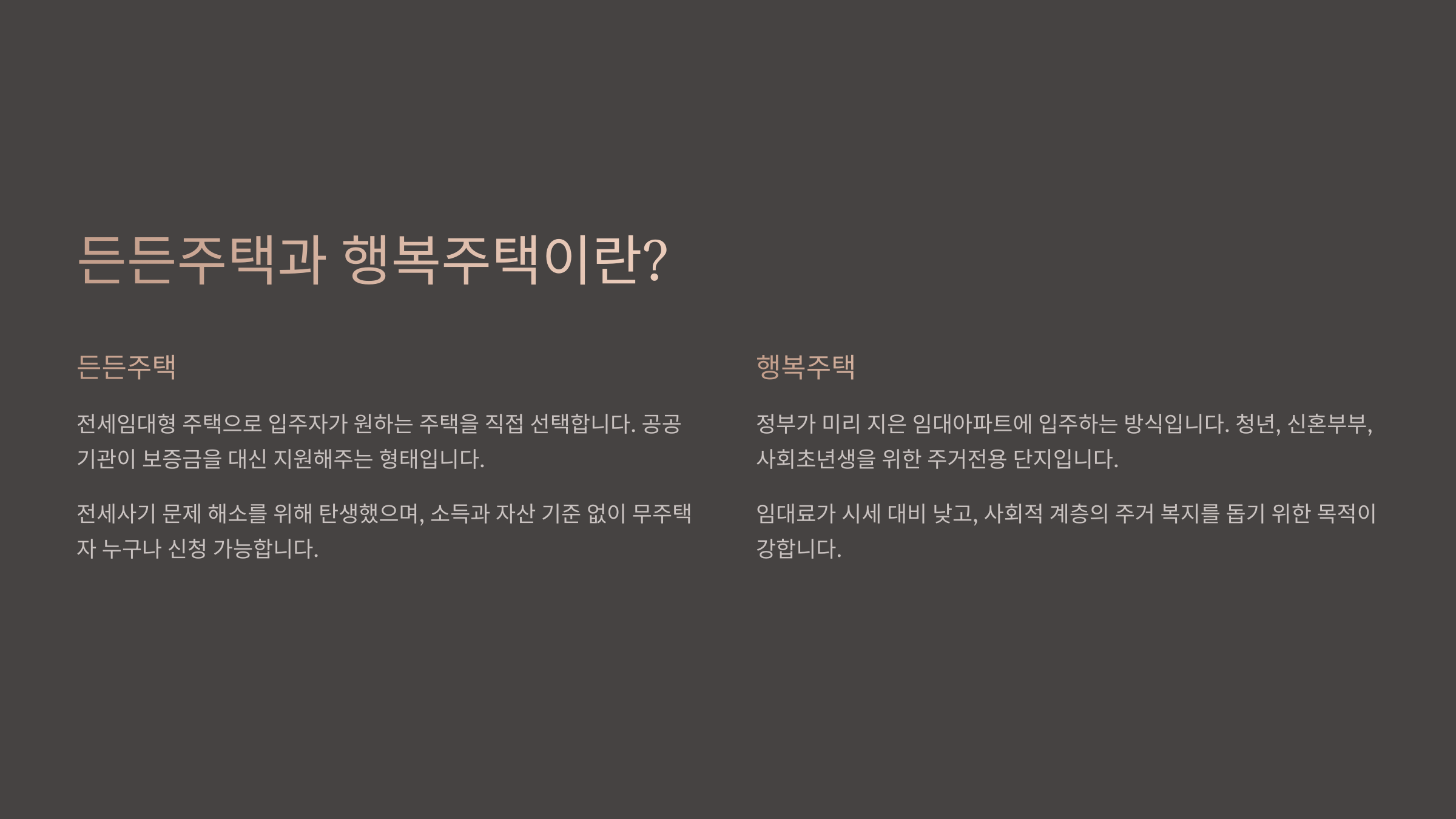 정리하자면, - 든든주택은 “내가 고르고, 정부가 보증해주는 전세” - 행복주택은 “정부가 준비한 단지에 저렴하게 월세” 라는 구조예요.