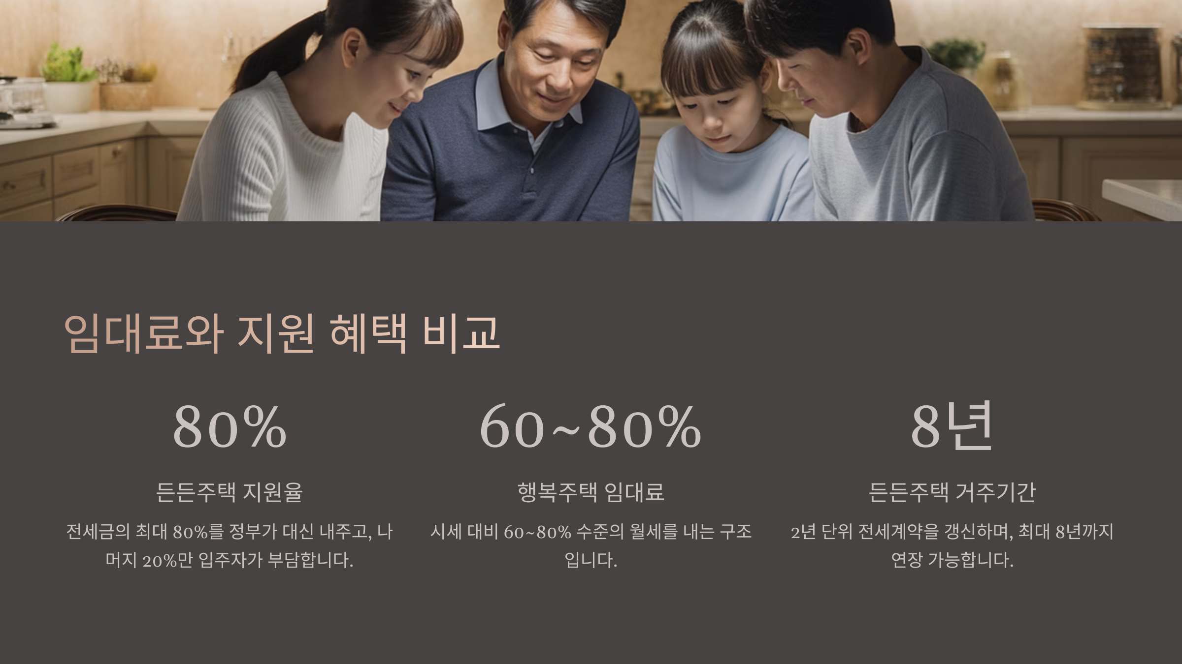 든든주택과 행복주택은 임대료 구조 자체가 다르기 때문에 직접적인 수치 비교보다는 '지원 방식'과 '부담 수준'을 비교하는 게 좋아요. 든든주택은 전세금의 최대 80%를 정부가 대신 내주고, 나머지 20%만 입주자가 부담해요. 이마저도 연 1~2% 수준의 저금리로 대출받을 수 있어 초기 비용이 매우 적어요.