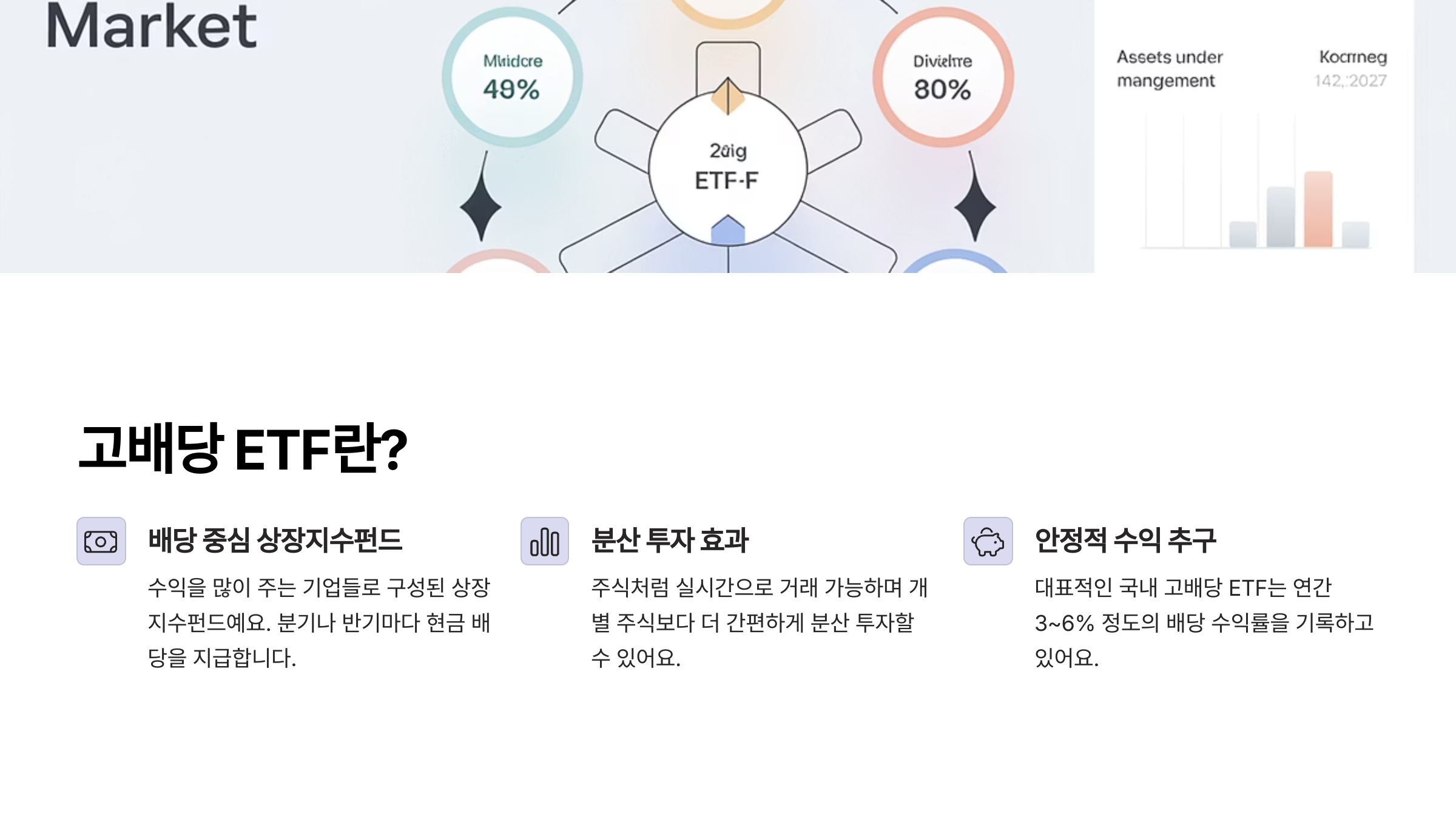 ETF는 펀드이지만 주식처럼 실시간으로 사고팔 수 있어서, 개별 주식보다 더 간편하게 분산 투자할 수 있다는 장점이 있어요. 고배당 ETF는 여기에 안정적인 배당 수익을 추가한 형태죠.