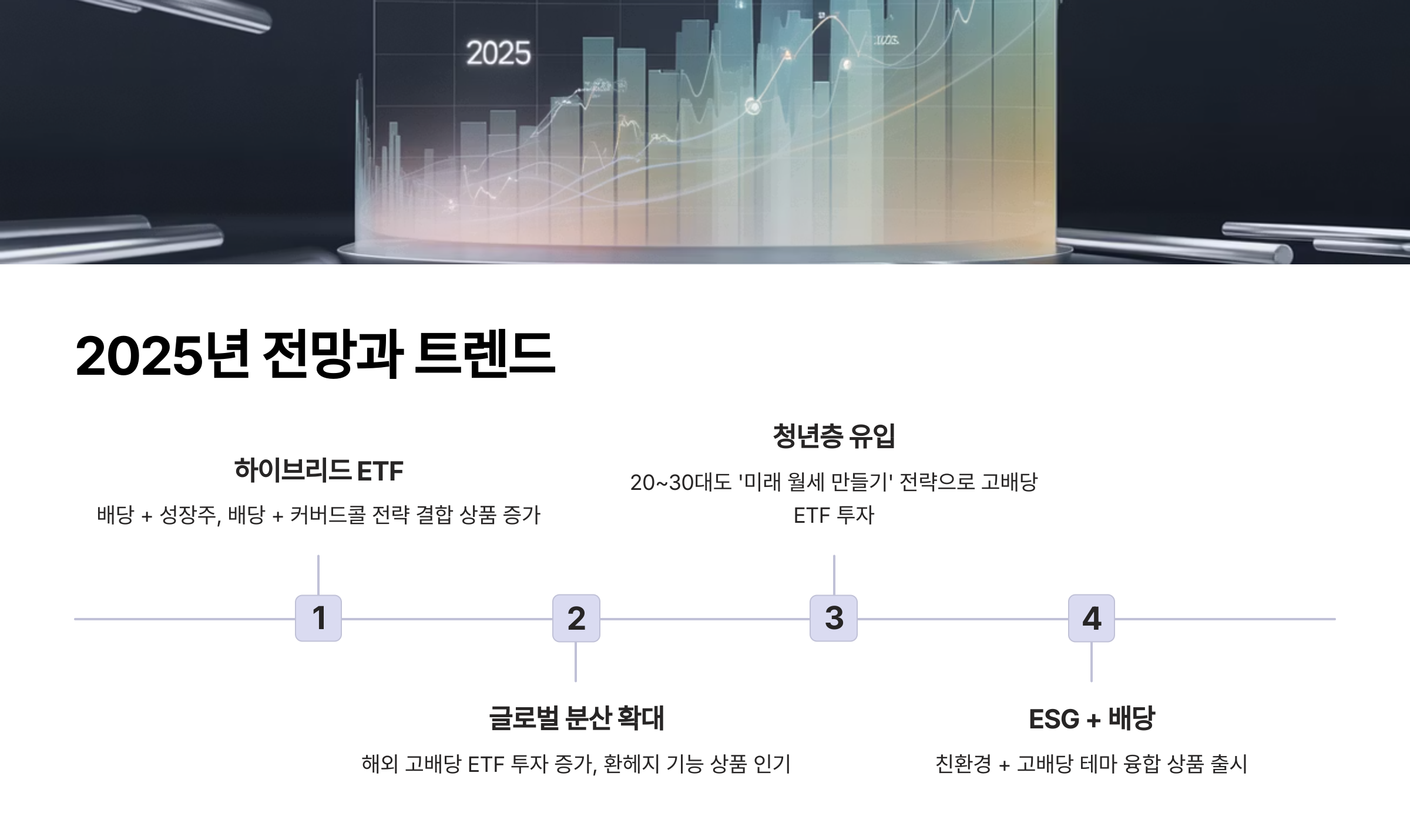 2025년은 고배당 ETF의 진화기라고 불러도 될 만큼 다양성과 유연성이 확대되고 있어요. 단순히 “많이 주는” 배당에서 벗어나, “지속적으로 주는” 구조에 관심이 쏠리고 있어요.