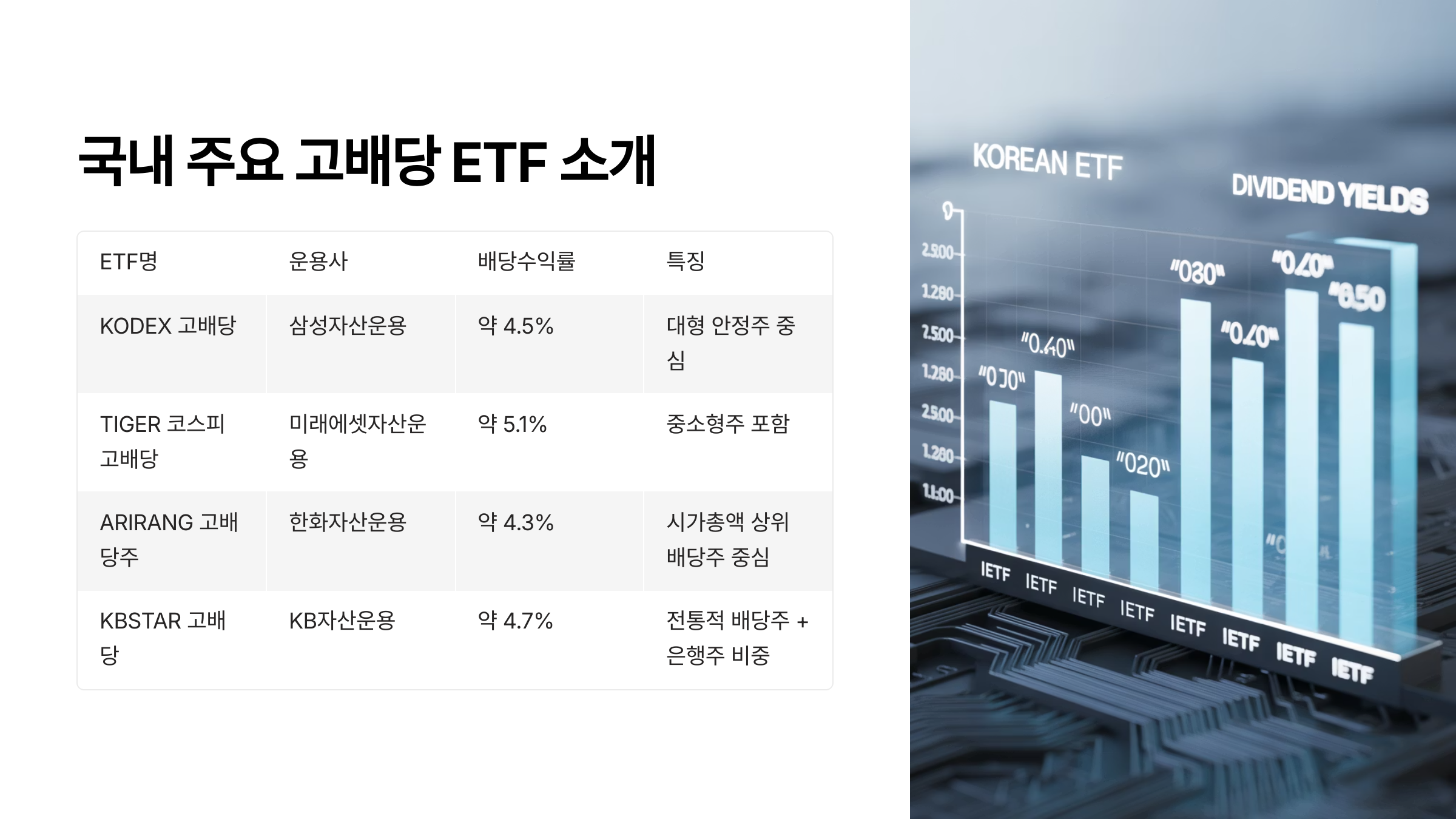 대표적인 국내 고배당 ETF는 KODEX 고배당, TIGER 코스피고배당, ARIRANG 고배당주, KBSTAR 고배당 등이 있어요. 이 ETF들은 대부분 연간 3~6% 정도의 배당 수익률을 기록하고 있어요.