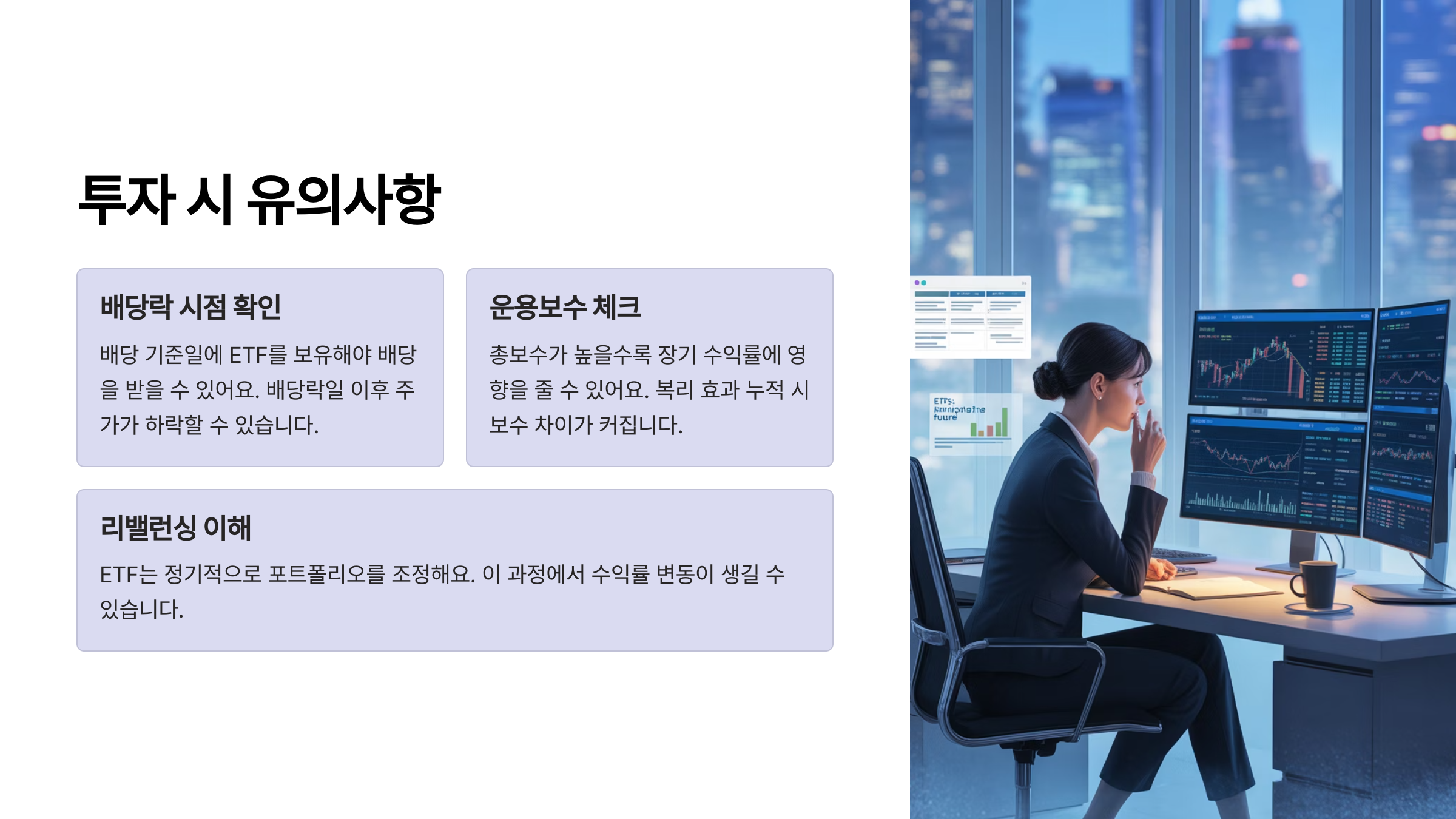 첫 번째는 ‘배당락’ 시점이에요. 배당을 받기 위해서는 배당 기준일에 ETF를 보유하고 있어야 해요. 배당락일 이후 주가가 하락하는 경우도 많기 때문에 단기차익보다는 장기 관점에서 접근하는 게 좋아요. 📉
