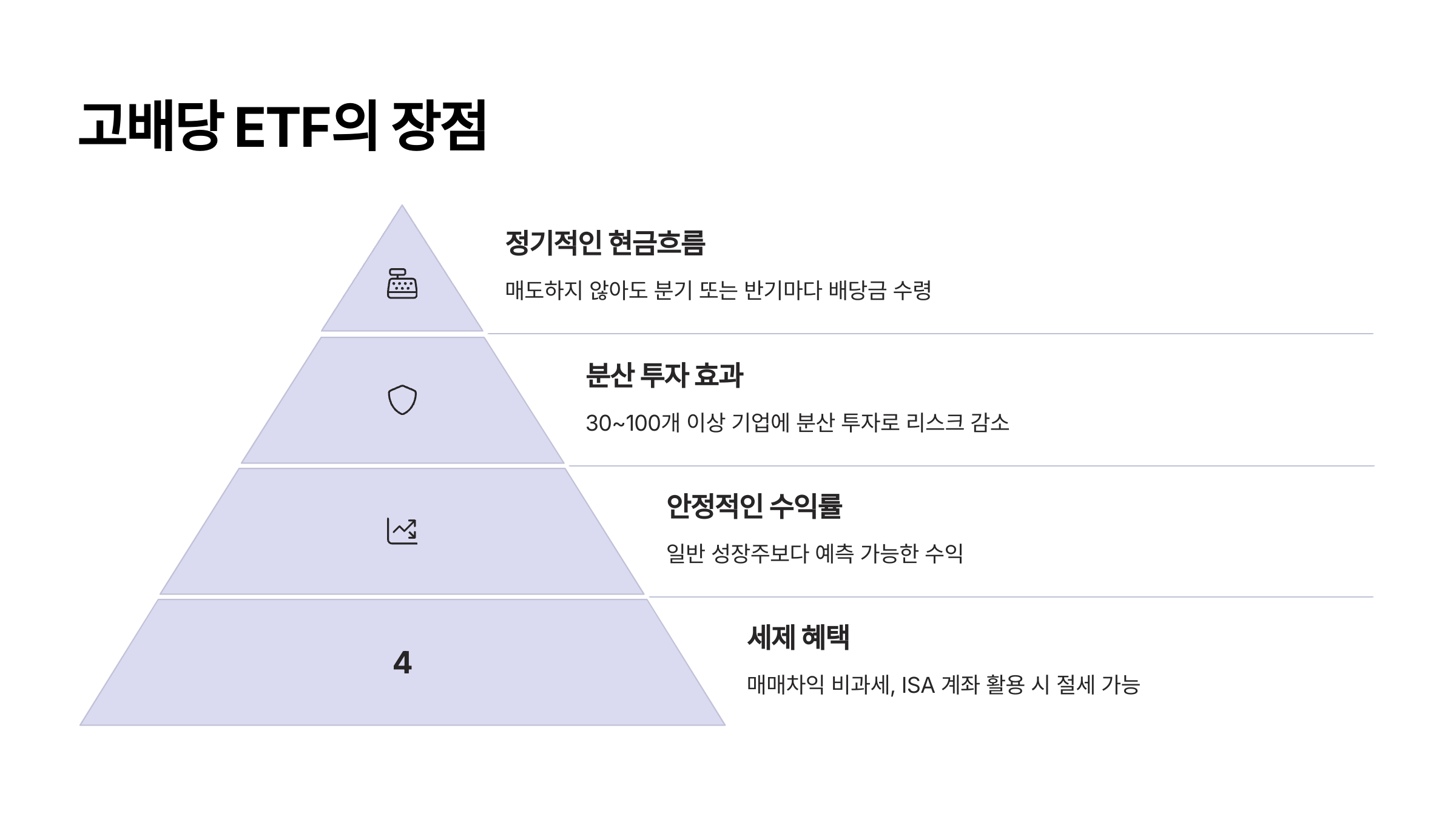 고배당 ETF의 가장 큰 장점은 정기적인 현금흐름이에요. 주식 투자와 달리 매도하지 않아도 분기 또는 반기마다 배당금을 받을 수 있어서 장기적인 자산관리에 좋아요. 특히 소득이 일정하지 않은 분들에게 큰 도움이 돼요. 💵