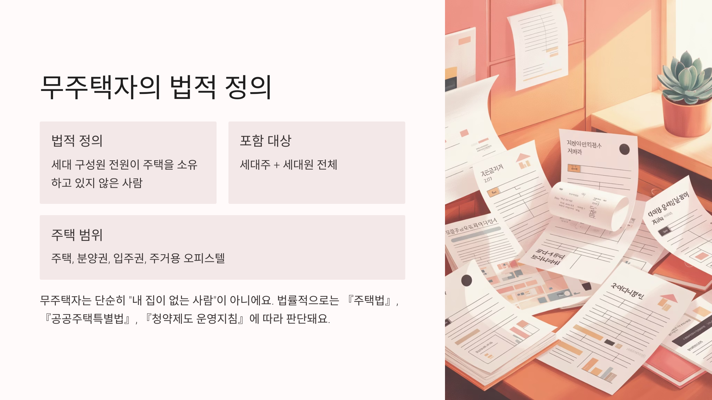 ‘무주택자’는 단순히 “내 집이 없는 사람”으로 생각하기 쉽지만, 정부 청약, 임대주택, 세금 혜택 등을 받기 위한 공식적인 기준에서는 보다 구체적인 정의가 있어요. 법률적으로는 『주택법』, 『공공주택특별법』, 『청약제도 운영지침』 등에 따라 판단돼요.