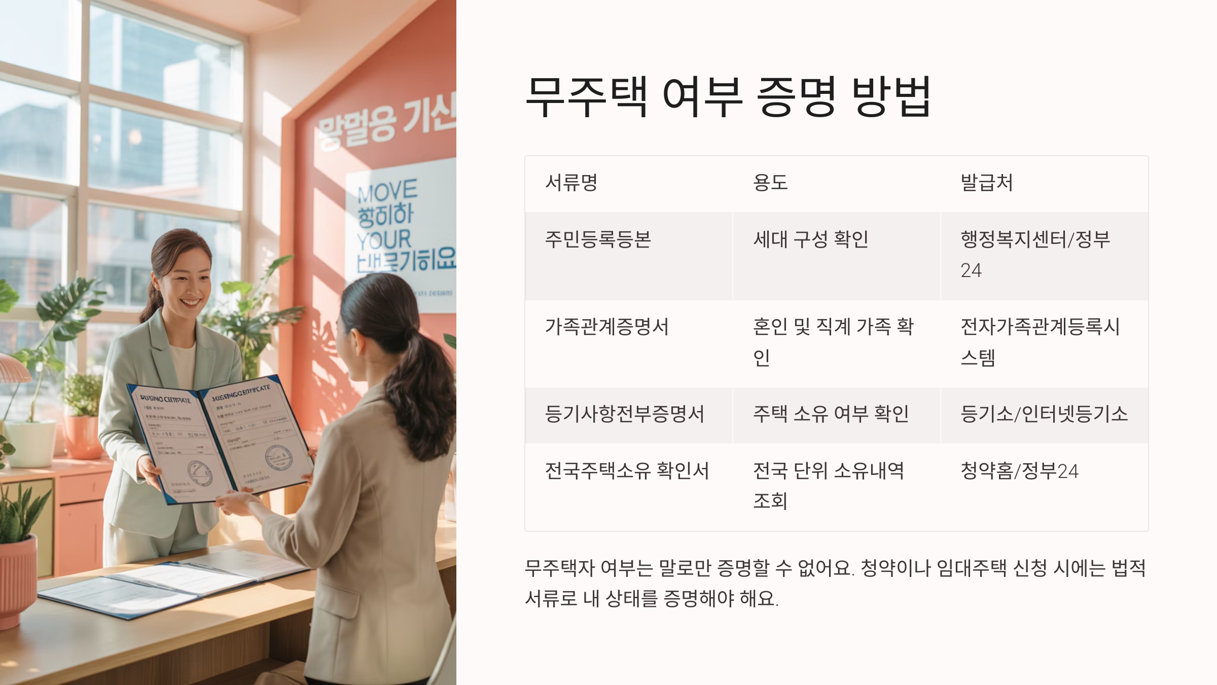 무주택자 여부는 말로만 증명할 수 없어요. 청약이나 임대주택 신청 시에는 **법적 서류**로 내 상태를 증명해야 해요. 이 증명은 주로 부동산 소유 여부와 세대 구성 확인을 통해 이뤄지며, 기관마다 요구 서류가 조금씩 달라요.