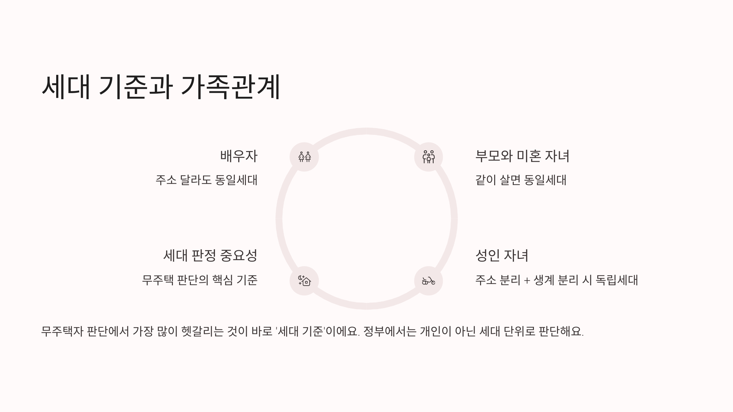 무주택자 판단에서 가장 많이 헷갈리는 것이 바로 ‘세대 기준’이에요. "나는 집이 없는데 왜 무주택자가 아니라고 하지?" 하는 경우, 대부분이 세대 구성원 중 누군가가 주택을 보유한 상황이에요.