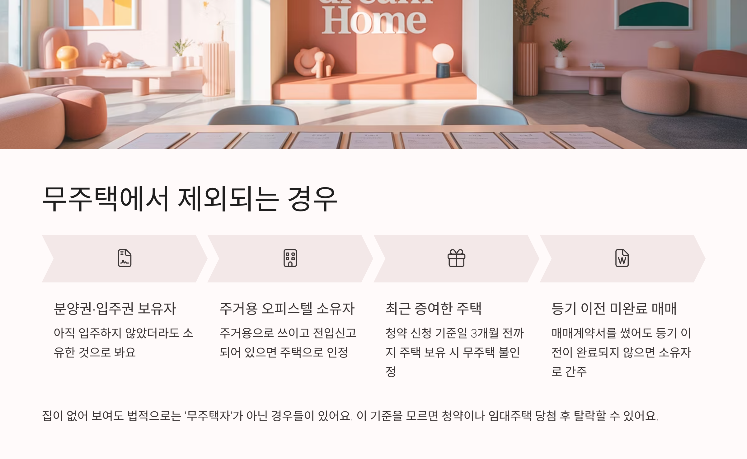 이번에는 집이 없어 보여도 법적으로는 ‘무주택자’가 아닌 경우들을 정리해볼게요. 신청자들이 자주 혼동하는 부분이라서, 이 기준을 모르면 청약이나 임대주택 당첨 후 자격 미달로 탈락할 수 있어요. ⚠️