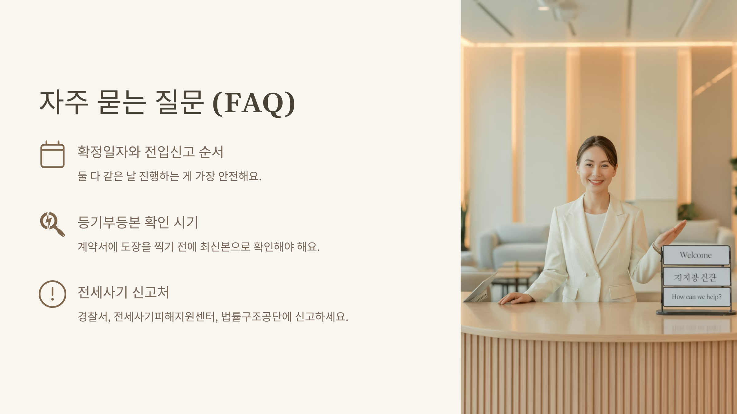 확정일자는 계약서 원본에 도장을 찍어주는 방식으로 받게 되고, 전입신고는 주소 변경과 동시에 처리돼요. 두 가지를 같은 날 처리하는 게 가장 안전한 방법이에요.