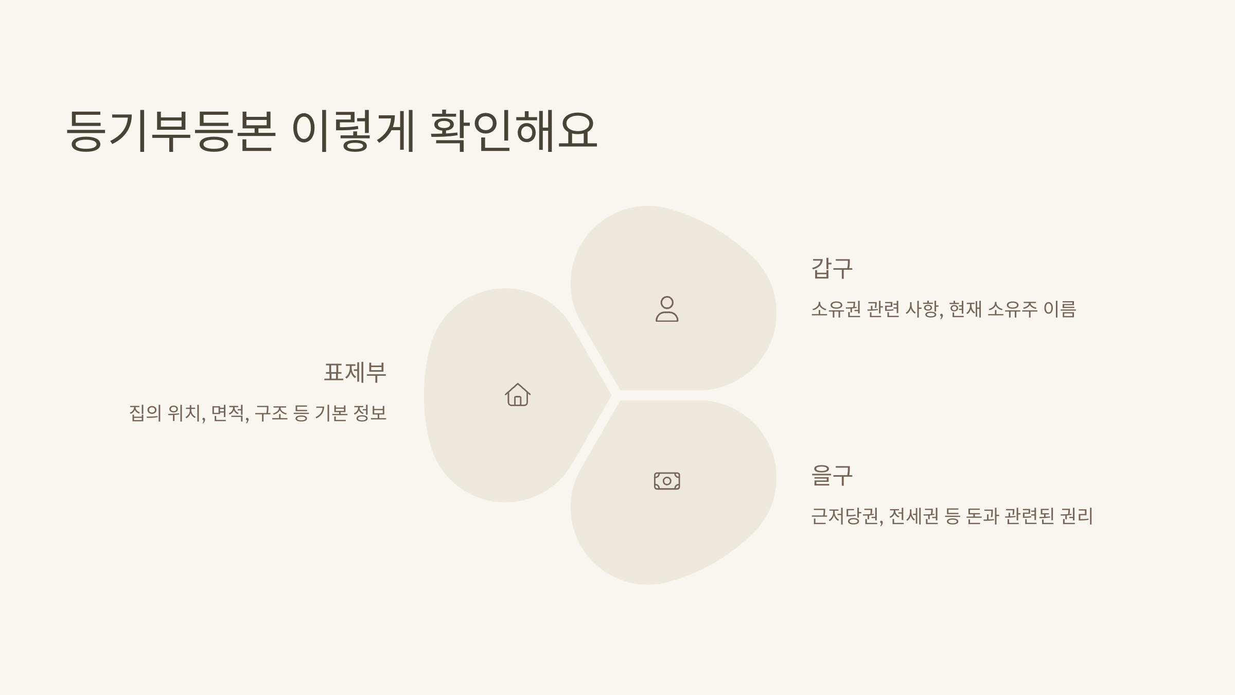 등기부등본은 누구나 열람 가능하고, 인터넷등기소(www.iros.go.kr)에서 발급받을 수 있어요. 등기부등본은 총 세 부분으로 나뉘는데, 표제부, 갑구, 을구가 있어요.