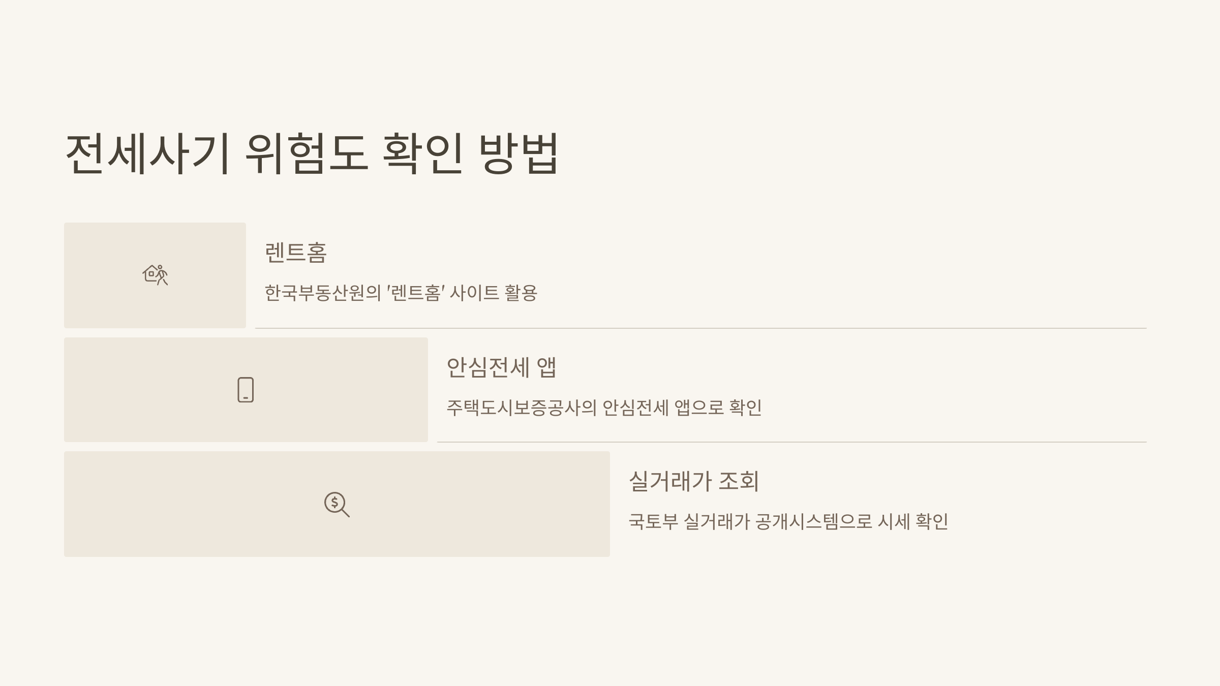 A8. 한국부동산원 ‘렌트홈’이나 ‘안심전세 앱’, 등기부등본, 실거래가 조회로 대략적인 위험도를 확인할 수 있어요.