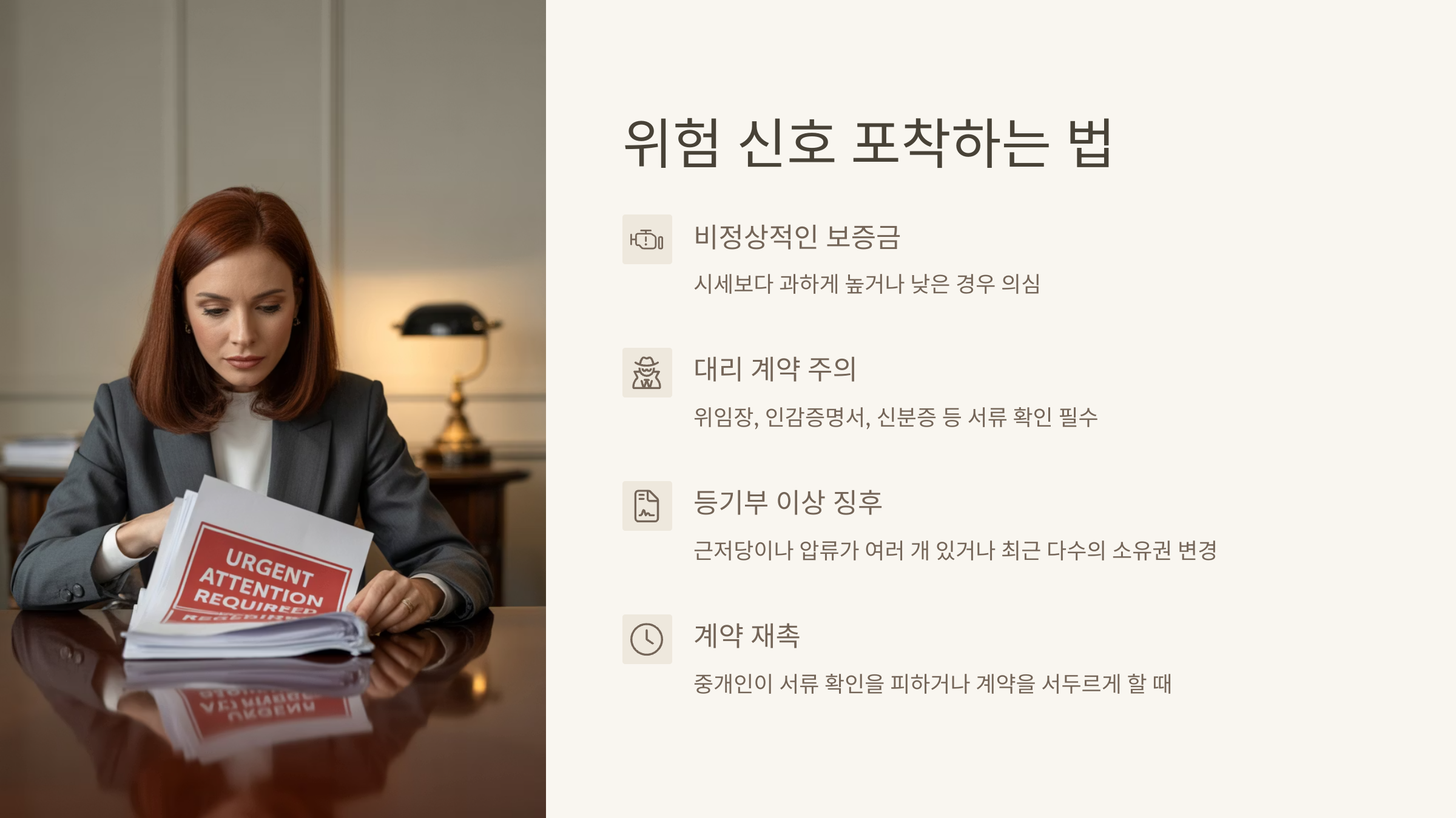 첫째, 전세보증금이 시세보다 과하게 높거나 낮은 경우예요. 시세보다 비정상적으로 높은 보증금은 갭투자 또는 사기일 수 있고, 시세보다 너무 낮은 경우는 급매나 문제가 있는 집일 가능성이 커요.
