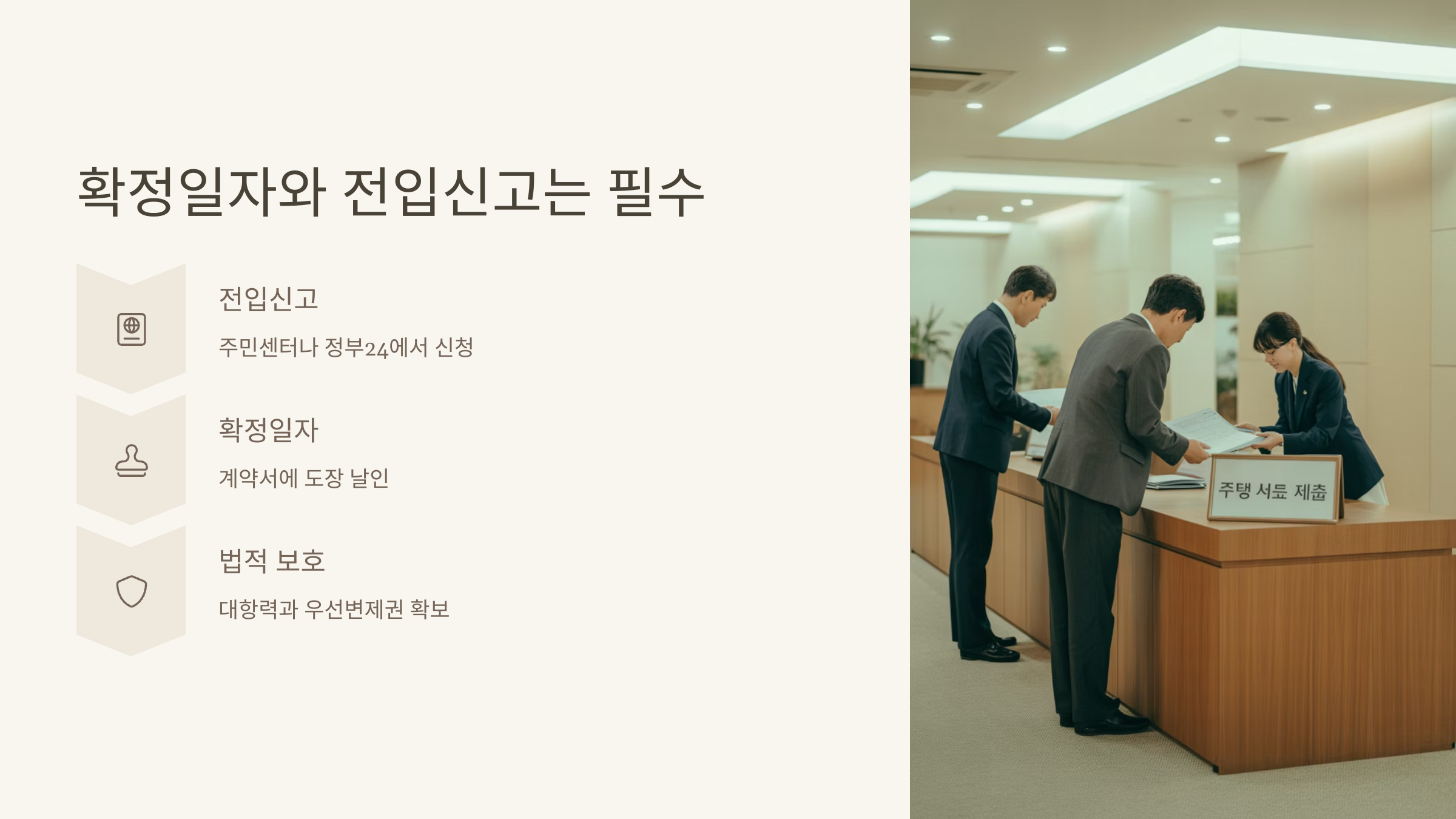 전입신고는 주민센터에 가서 신청하면 되고, 확정일자는 전입신고와 동시에 받을 수 있어요. 요즘은 온라인으로도 가능해서 정부24 사이트를 이용하면 편리해요. 두 가지를 함께 해야 ‘대항력’과 ‘우선변제권’이 생겨요.