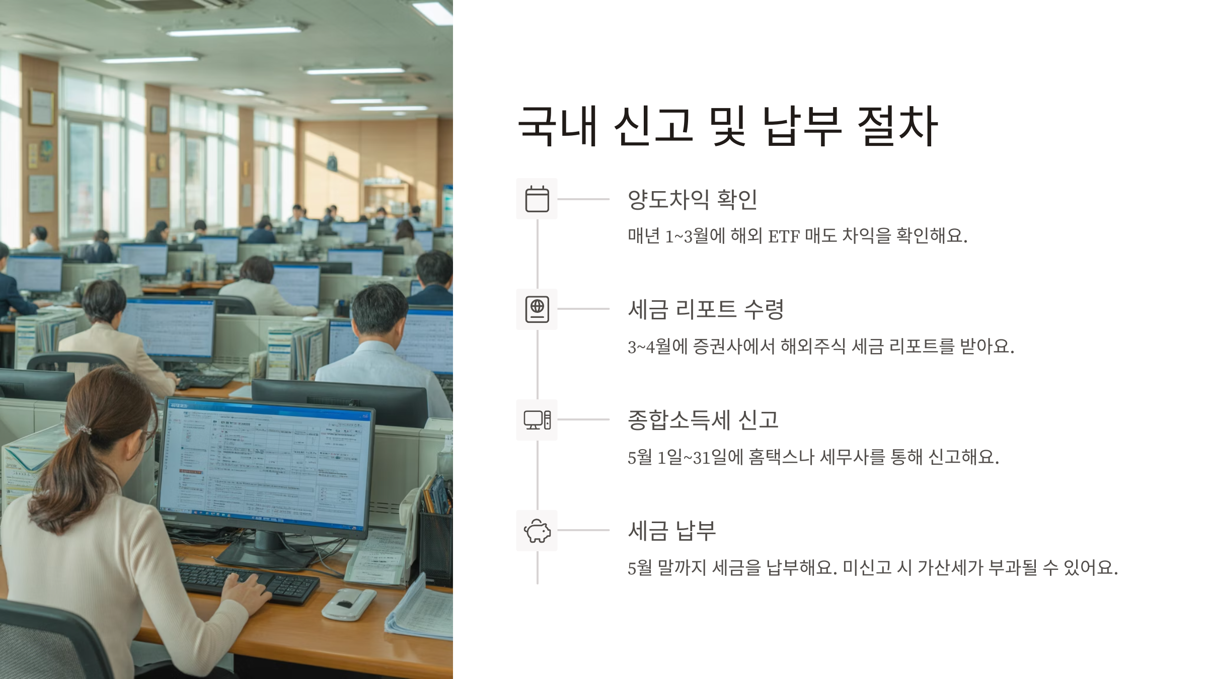 해외 ETF에서 수익이 발생하면, 국내에서는 종합소득세 신고를 통해 양도소득세를 자진 신고·납부해야 해요. 이건 증권사나 국세청이 알아서 떼가는 구조가 아니라, 투자자가 매년 5월에 직접 신고하는 방식이에요. 📆