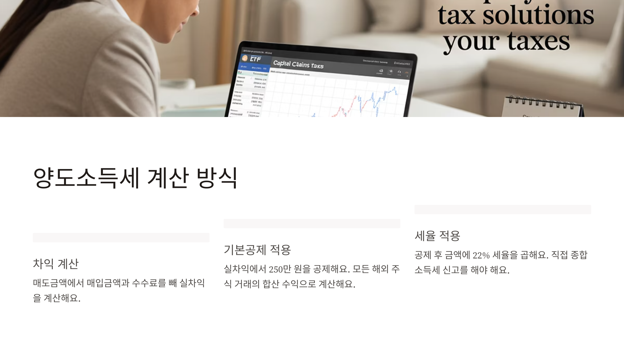 양도차익(ETF 매도 후 생긴 차익)은 한국에서 별도로 세금 신고를 해야 해요. 이때 적용되는 세금은 양도소득세로, 250만 원의 기본공제를 뺀 후 22%의 세율(지방세 포함)이 적용돼요.
